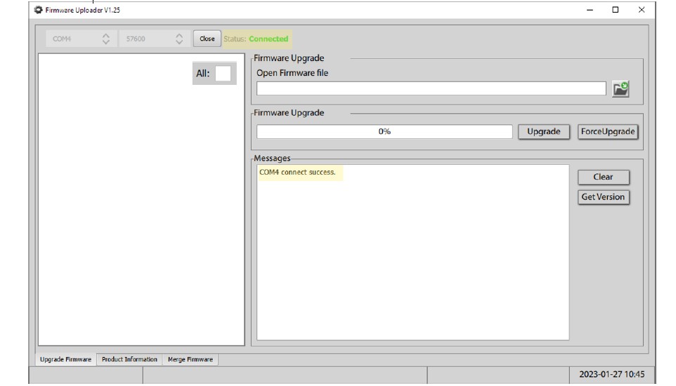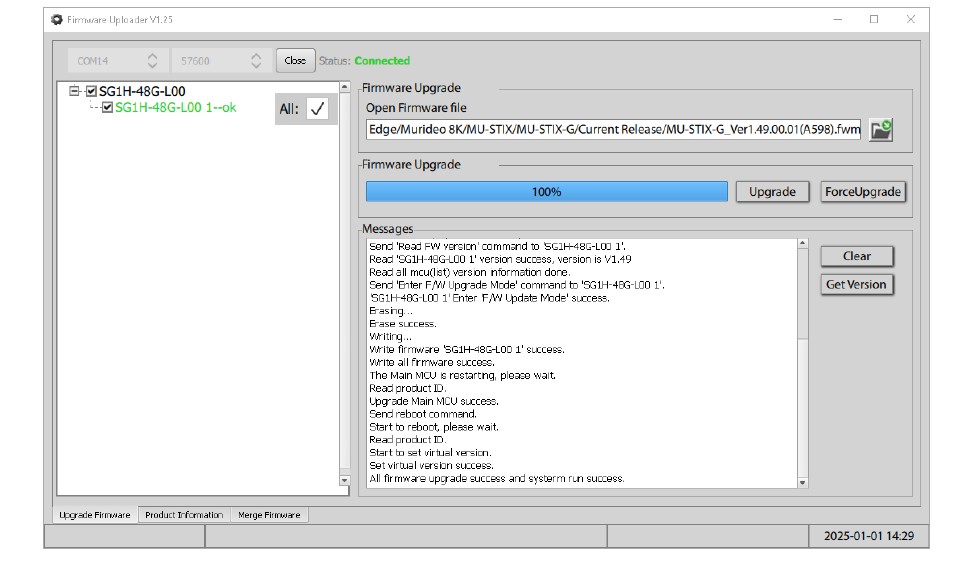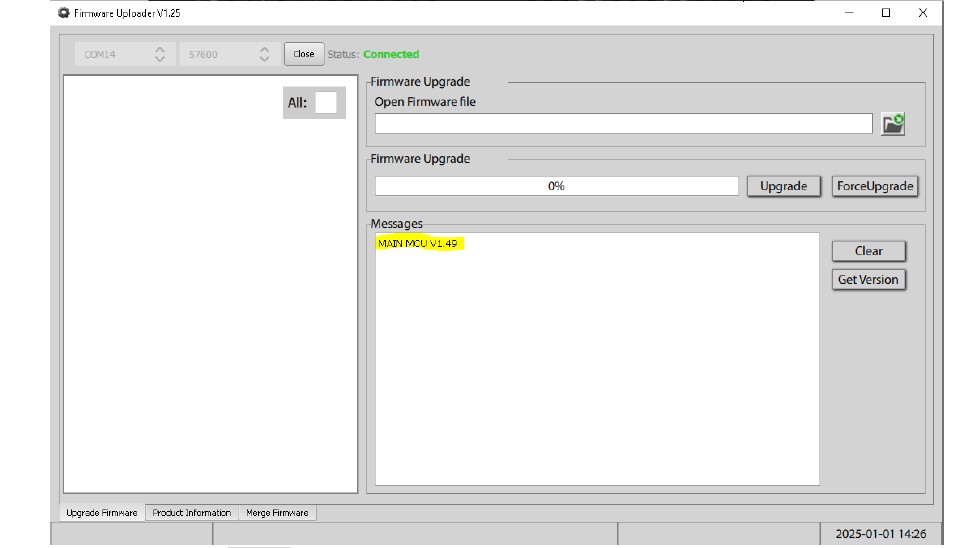 9. ロードバーが100%に達したら、再度「バージョン取得」ボタンを使用し、新しいファームウェアバージョンが正しいことを確認してください(注:以下のスクリーンショットはあくまで例であり、正確なバージョンが表示されない場合があります)。