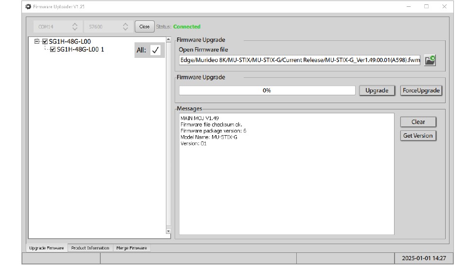 8. アップグレードボタンを選択してファームウェア更新を開始します。進行状況バーは99%で数秒間停止した後、自動的にユニットを再起動します。強制アップグレードボタンは使用しないでください。何らかの理由でアップローダーがファームウェアを更新しない場合は、EDIPIT迄連絡いただき、STIX-GFのトラブルシューティングをご協力ください。