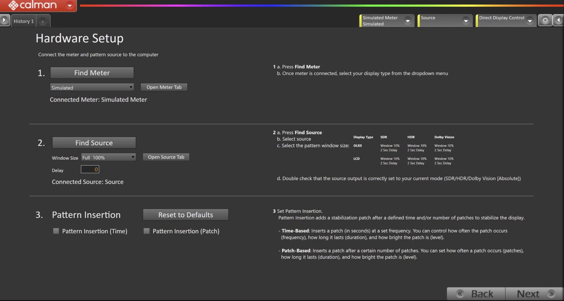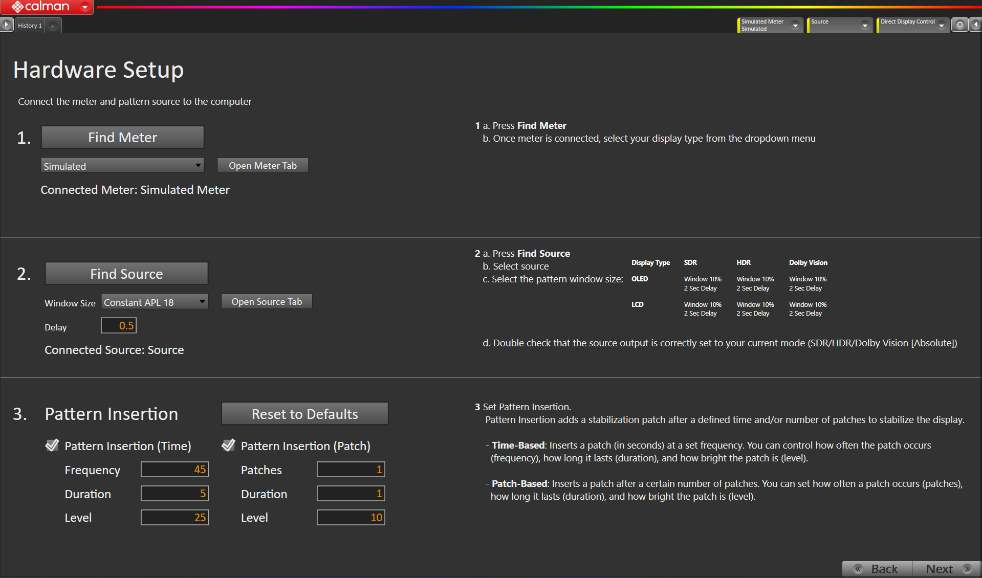 デフォルトにリセットボタンをクリックして、手順1のディスプレイとキャリブレーションタイプに適切なパターン挿入を設定します。