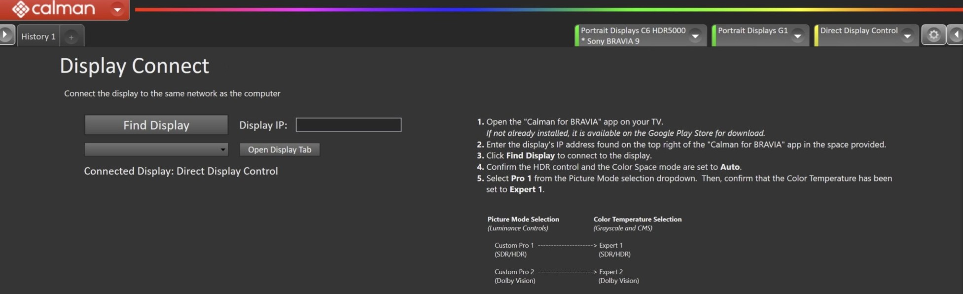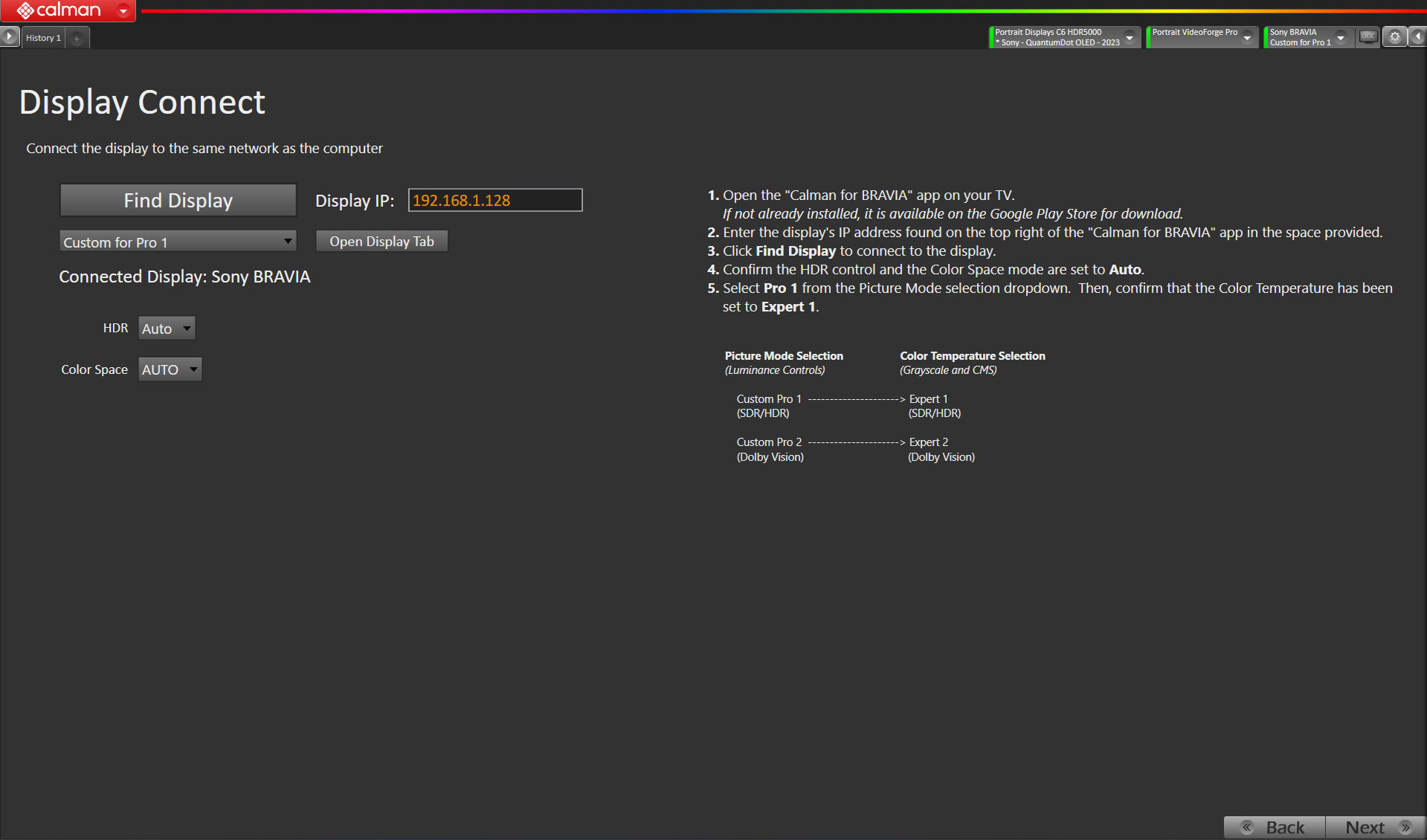 Calman for BRAVIAアプリに表示されているIPアドレスを入力し、「ディスプレイを検索」 ボタンをクリックします。接続が成功すると、DDCタブにSony BRAVIAが表示されます。
