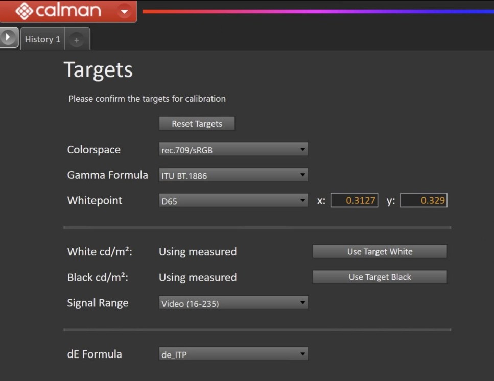 ・キャリブレーションターゲットを確認/設定します。これらはステップ1のオプションによって自動的に共通のデフォルトに設定されます。